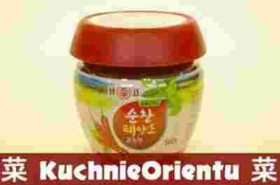 Gochujang (czyt. Go-czu-dżang) koreańska ostra pasta z chili. Bez tej pasty nie można sobie wyobrazić kuchni koreańskiej, zazwyczaj stosuje się ją jako składnik dania, bardzo często podaje się ją się też jako dodatek do dań (jak u nas np. musztardę). Bardzo ostra o specyficznym, ciekawym smaku. Świetny dodatek dla miłośników ostrych, orientalnych smaków, z nim każda kiełbaska czy kotlet smakuje po koreańsku. Poznałem ją podczas mojej wizyty w Korei w 2004 roku, przywiozłem z sobą 2 opakowania - starczyły na rok. Potem szukałem jej w Polsce ale bez skutku, ostatnio udało mi się jednak ją namierzyć i teraz jest dostępna w mojej ofercie. Pojemnik 500g starczy na kilka miesięcy. Polecam! Skład: syrop kukurydziany, woda, mąka pszenna, czerwona papryka (12,2%), pszenica, sól morska, czosnek, soja, cebula, alkohol, wzmacniacz smaku (glutaminian sodu), glukoza, konserwant (sorbinian potasu), zagęszczacz (guma ksantanowa), pleśń koji (aspergillus oryzae) . Produkcja: Korea.