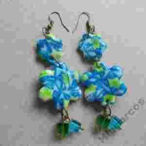 | Kolczyki wykonane z ręcznie lepionych kwiatków z modeliny fimo. Modelina połączona jest ze szklanymi koralikami i elementami w kolorze starego złota. Długość całkowita ok. 9.5cm. Do kolczyków bransoletka wystawiona oddzielnie. |