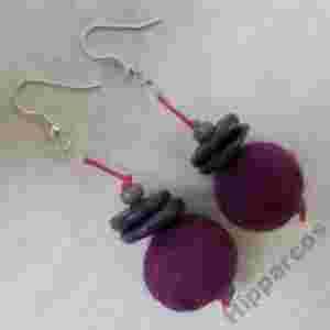 | Kolczyki wykonane z filcowanych na mokro kulek o średnicy ok 2cm. Filc połaczony jest z talerzykami z modeliny i szklanymi koralikami. Całość zawieszona na różowym sznurku woskowanym. Bigle posrebrzane antyalergiczne. Długość całkowita ok 7 cm. |