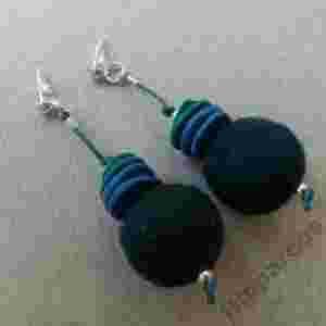 | Kolczyki wykonane z filcowanych na mokro kulek o średnicy ok. 2cm. Filc połaczony jest z talerzykami z modeliny. Całość zawieszona na sznurku woskowanym w kolorze zieleni morskiej. Sztyfty posrebrzane. Długość całkowita ok 7 cm. |
