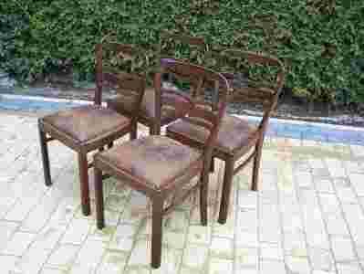 Witam serdecznie na mojej aukcji. Mam Państwu do zaoferowania komplet oryginalnych krzeseł w ilości czterech sztuk w stylu art-deco, pochodzących z okresu miedzywojennego.