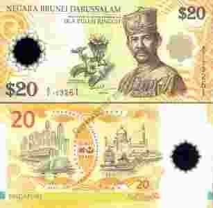 Przedmiotem niniejszej aukcji jest przepiękny banknot Brunei o nominale 20 dolarów, wyemitowany 16 lipca 2007 roku z okazji 40-tej rocznicy unii monetarnej zawartej pomiędzy Singapurem i Brunei - dającej możliwość swobodnej wymiany obu walut i możliwości stosowania obu środków płatności w obu krajach (kurs wymiany jest stały - 1:1 :-).