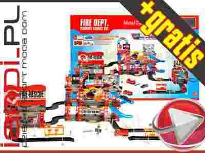 Straż pożarna posiada garaże, tory zjazdowe, miejsce do lądowania helikoptera, wóz strażacki z drabiną, samochód osobowy, znaki drogowe. Niesamowity zestaw dla każdego chłopca małego i dużego : )