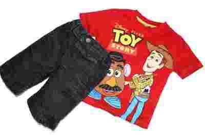 rewelacyjny komplecik dla chłopca w skład którego wchodzi bluzeczka z bohaterami bajki Toy Story firmy George w stanie idealnym jak nowa. oraz krótkie spodenki jeans firmy NEXT.