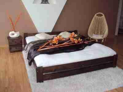 Łóżko wykonane jest w całości z litego drewna sosnowego. Najpierw ręcznie bejcowane na kolor orzech , następnie lakierowane lakierem bezbarwnym ekologicznym , szlifowane i kolejny raz lakierowane lakierem bezbarwnym, tylko takie wykonanie daje rewelacyjny efekt końcowy !!!!!! Łóżka wykonane są bardzo starannie i dokładnie , NA RAMĘ ŁÓZKA DAJEMY 2 LATA GWARANCJI !!!!!!!!!!!!!!!!!!!!!!!!