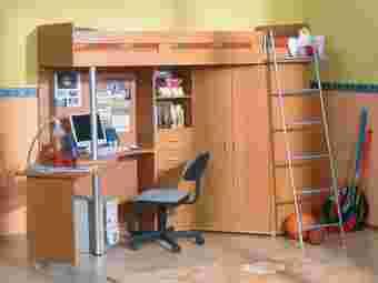 - Twoja latorośl nie tylko będzie cieszyła się snem w piętrowym łóżku, ale także nowocześnie wykonanym biurkiem i mini-garderobą tuż obok.