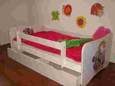 Łóżko posiada sosnową barkierkę zabezpieczająca,