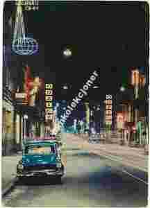 Łódź nocą Piotrkowska samochód Wartburg neony