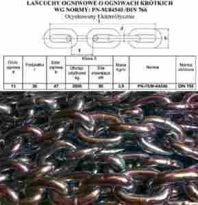 Oferowane łańcuchy wykonywane są według polskich norm PN-75/M-84540, PN-75/M-84541, PN-75/M-84543, PN-G-46701 oraz warunków technicznych będących odpowiednikiem norm niemieckich DIN 766, DIN 764, DIN 763, DIN 762, DIN 22252 i DIN 5684 oraz normy ISO 610. Posiadamy szeroki asortyment łańcuchów na magazynie.