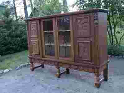 Ładna rzeźbiona dębowa komodo-witryna.