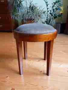 Przedmiotem licytacji jest bardzo ładny , zabytkowy taboret ( stołek , zydelek ) z tapicerowanym siedziskiem . Przedmiot pochodzi z lat 1910 - 1920 . Mebelek zrobiono z drewna brzozy i zabarwiono na ładny odcień brązu . Stołeczek prezentuje się doskonale ponieważ został poddany gruntownej renowacji . Odnowiono zarówno część drewnianą , jak i tapicerowaną . Do renowacji drewna użyto politury szelakowej. Siedzisko zostało na nowo wypełnione i powleczone dobrej jakości materiałem - pluszem w kolorze oliwkowym . Niestety , na fotografiach materiał ma kolor szary - co nie jest zgodne ze stanem faktycznym . Do wykończenia użyto taśmy w kolorze brązowym . Jak widać na zdjęciach taboret prezentuje sie doskonale . Mimo prostej formy jest dekoracyjny . Wykonano go bardzo starannie , zadbano o detale . Stan zachowania przedmiotu : bardzo dobry , nie ma żadnych peknięć czy śladów po owadach . Konstrukcja stołeczka jest naprawdę solidna i stabilna . Jedyny mankament stanowi wglębienie w drewnie tuż przy siedzisku . Nie jest to pęknięcie . Nie wpływa to w zadnym stopniu na urodę mebelka ( co widac na ostatnim ze zdjęć ) , nie mniej istnieje . Stołeczek prezentuje się naprawdę wspaniale . Polecam .