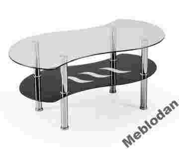 Ława z blatem szklanym, dodatkową półką szklaną oraz metalowym stelażem.