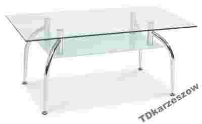 Duża prostokątna ława szklanana metalowym stelażu ze szklana półką.