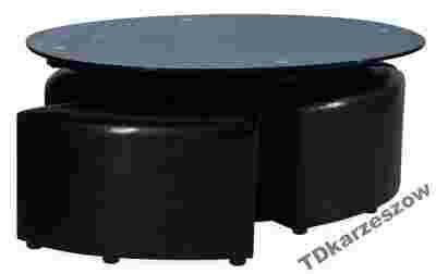 Duża owalna ława szklana na drewnianym stelażu z czterema tapicerowanymi pufami.