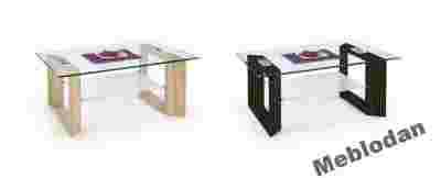 Ława z prostokątnym szklanym blatem, dodatkową szklaną półką oraz stelażem z płyty MDF laminowanej.