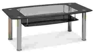 Przedmiotem aukcji jest ława TWIST w kolorze Szkło hartowane z czarnymi malowanymi obramówkami / dolna półka ze szkła malowanego na czarno / stelaż w kolorze chrom / nogi metal kolor chrom.