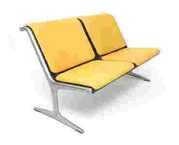 Dwuosobowa ławka industrialna z lat 70 projektu Friso Kramera dla Wilkhahn. Nogi z odlewu aluminium, konstrukcja siedziska z żywicy. Miękkie siedziska i oparcia w żółto-pomarańczowym kolorze. Ławki użytkowane 1972 roku na olimpiadzie w Monachium.