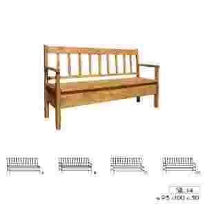 Sosnowa ławka pokryta jasnym woskiem, w standardzie oparcie z pionowymi szprosami, możliwość doboru krzeseł o takim samym wyglądzie, dostępne są cztery wersje końcowe ławki wybór należy do Was.