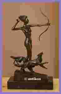 Niezwykle ekspresyjna grupa figuralna z prawdziwego brązu w stylu Art Deco. Przedstawia młodą kobietę z dwoma psami. Wspaniale zobrazowano moment sugerujący, że łuczniczka właśnie przed chwilą wypuściła strzałę. Dziewczynę i zwierzęta uchwycono w ruchu więc rzeźbę cechuje duża doza dynamizmu. Doskonale oddano również ponętność zgrabnej sylwetki modelki. Figura osadzona jest na prostokątnej podstawie z czarnego żyłkowatego marmuru. Odznacza się precyzją cyzelowania oraz lekkim patynowaniem. Dbałość o detale a także solidność wykonania wskazują na znaczne walory artystyczne tego wyrafinowanego dzieła rzeźbiarskiego. Przedmiot sygnowany jest Lorenzl i oznaczony numerem oraz pieczęcią francuskiego zakładu brązowniczego.