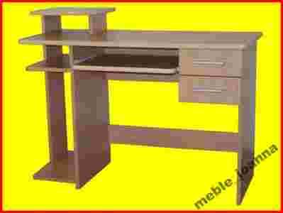 Biurko wykonane z wysokiej jakości płyty laminowanej o grubości 18mm w kolorze buk. Blat, półka pod klawiaturę i podstawka pod monitor zaowalone wykończone miękkim profilem PCV w kolorze laminatu. Biurko posiada dwie szuflady osadzone na plastykowych prowadnicach. Wysuwna półka pod klawiaturę osadzona na metalowych prowadnicach rolkowych. Uchwyty szuflad plastykowe w kolorze satynowym. Biurko stoi na plastykowych ślizgaczach.