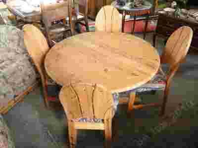 Śliczny, zestaw do salonu lub jadalni wykonany z solidnego jasnego drzewa. Zestaw składa się ze stołu i czterech pięknych krzeseł. Stół okrągły na czterech nóżkach zakończony krzyżakiem, nierozkładany. Siedzisko krzesła wykonane z gąbki obitej wytrwałym i kolorowym materiałem. Nogi stołu i krzeseł są proste i smukłe. Komplet przede wszystkim cechuje funkcjonalność, ale również niezwykłe dostojny charakter. Wprowadzi do każdego mieszkania niezwykły urok.