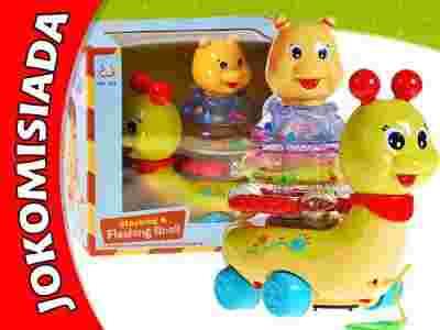 Na grzbiecie ślimaka umieszczono wielobarwne światełka, które w trakcie zabawy podświetlają ślimaczka.