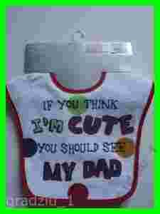 Śliniaki są białe z czerwonym i granatowym obszyciem na brzegach. Na środku kolorowe aplikacje :)