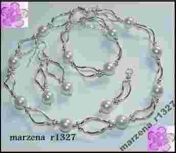 Komplet wykonany jest z posrebrzanych elementów, linki jubilerskiej i szklanych pereł.