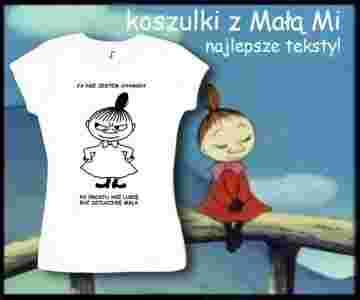 z czarnym nadrukiem Małej Mi i jej śmiesznych tekstów.