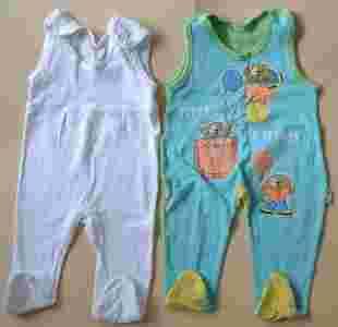 - śpiochy bawełniane - zapinane na ramionach - białe - materiał w prążki - drugie z przodu niebieskie z aplikacją, a z tyłu zielone