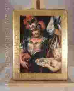 Nierówności są celowe i wraz z delikatną siatką spękań i patyny nadają stylowy stary charakter ikonie. Ten ciekawy efekt został osiągnięty dzięki własnej technice z udziałem transferu.