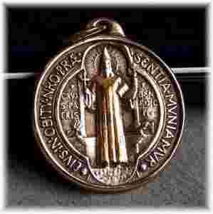 Z jednej strony (awers) medal przedstawia św. Zakonodawcę trzymającego w prawej ręce mały krzyż, a w lewej księgę (świętą Regułę); na obrzeżu widnieje napis: Eius in obitu nostro praesentia muniamur (Niech Jego obecność broni nas w chwili śmierci). Przy postaci świętego - napis: Crux sancti patris Benedicti (Krzyż świętego Ojca Benedykta).