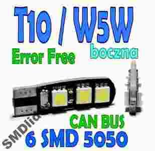 Aukcja dotyczy jednej żarówki T10 / W5W 6 SMD 5050 LED CAN-BUS Error Free BIAŁA MOCNA - BOCZNA W DWIE STRONY