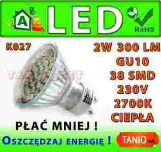 ŻARÓWKA GU10 LED 38 SMD HALOGEN WARM 300lm 2W K27