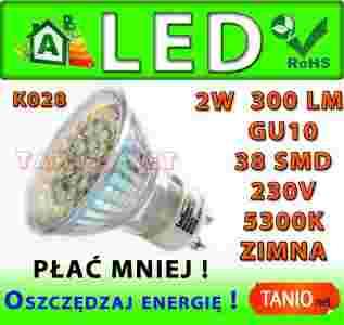 ŻARÓWKA GU10 LED 38 SMD HALOGEN ZIMNA 300lm 2W K28