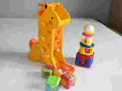 Żyrafa FISHER PRICE + klocki sensoryczne + wieża