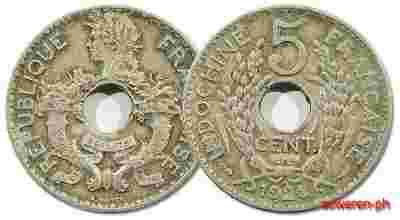 10.INDOCHINY FRANCUSKIE, KOL.FRANC., 5 CENTOW 1924