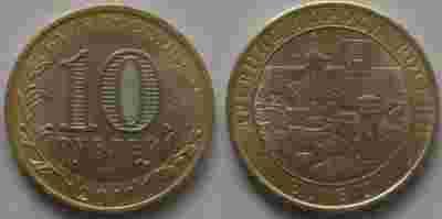 Rosyjska okazjonalna moneta bimetalowa (mosiądz/alpaka) nominale 10 rubli z serii „Stare miasta Rosji” –„Jelec”- emitowana w 2011 roku.