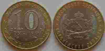 Rosyjska okazjonalna moneta bimetalowa (mosiądz/alpaka) nominale 10 rubli z serii „Okręgi administracyjne” –„Woroneżska obłast”- emitowana w 2011 roku.