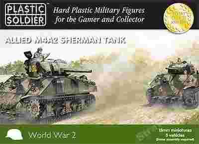 Easy Assembly plastic injection moulded 15mm Allied M4A2 Sherman tank. Five vehicles in the box and each sprue gives options to build either a 75mm or 76mm version and comes with 2 commander figures - UK or US.