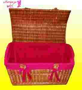 Kufer wykonany z materiału ekologicznego - naturalnej wikliny - bardzo trwały i wygodny w użyciu, jest wykonany bardzo starannie i dokładnie. Rączki kosza są mocne i solidne. Wypukłe wieko skrzyni jest zamocowane na drucianych zawiasach.Kosz wyposażony jest w wkład materiałowy w kolorze różowym, który spełnia funkcję ochronną jak i dekoracyjną.Wkład mocowany jest za pomocą kokard, można go zdjąć i uprać ręcznie lub w pralce. Kufer jest nie tylko praktyczny, ale też bardzo ładny i będzie przydatnym przedmiotem w każdym domu. Polecamy go szczególnie na bieliznę, ale sprawdzi się również jako kosz na rzeczy do prasowania, zabawki, lub różne domowe skarby. Znajdzie na pewno jeszcze wiele innych zastosowań w domu. Wyroby wiklinowe są praktycznie wykorzystywane od wielu pokoleń dzięki swojej użyteczności i uniwersalnemu zastosowaniu. Ciepłe kolory wikliny naturalnie komponują się z każdą przestrzenią i stanowią również element dekoracyjny. Jesteśmy przekonani, że jakkolwiek wykorzystany spełni wszystkich oczekiwania.