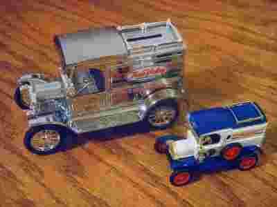 DO SPRZEDAŻY: DWA MODELE FORD "T" Z 1913 ROKU, OBA TO SAMOCHODY DOSTAWCZE FIRMY TRUE VALUE HARDWARE. JEDEN - SREBRNY - W SKALI 1/25. NUMER SERYJNY 19900. MODEL METALOWY (DIE-CAST) Z PLASTIKOWYMI CZĘŚCIAMI. JEST TO SKARBONKA NA MONETY. DRUGI MODEL - BIAŁO/NIEBIESKI - W SKALI 1/43. MODEL METALOWY (DIE-CAST) Z PLASTIKOWYMI CZĘŚCIAMI. OBA SAMOCHODY WYPRODUKOWANE PRZEZ ERTL W 2000 ROKU. OBA ZAPAKOWANE W JEDNYM PUDEŁKU JAKO KOMPLET. STAN - NOWY.