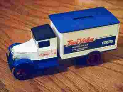 DO SPRZEDAŻY: CIĘŻARÓWKA HAWKEYE Z 1931 ROKU, SAMOCHÓD DOSTAWCZY FIRMY TRUE VALUE HARDWARE. W SKALI 1/25. WYPRODUKOWANY PRZEZ ERTL W 1991. STAN - NOWY, ZAPAKOWANY. MODEL METALOWY (DIE-CAST) Z PLASTIKOWYMI CZĘŚCIAMI. TEN MODEL JEST SKARBONKĄ NA MONETY. NUMER SERYJNY 1131M.