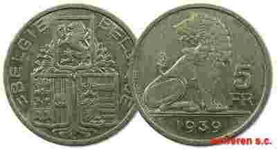 19.BELGIA, LEOPOLD III, 5 FRANKÓW 1939