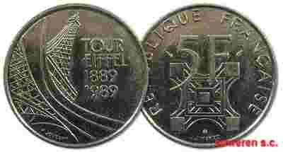 25.FRANCJA, 5 FRANKÓW 1989 WIEŻA EIFFLA