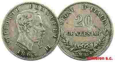 27.WŁOCHY, VITT.EMANUEL II, 20 CENTESIMI 1863 M