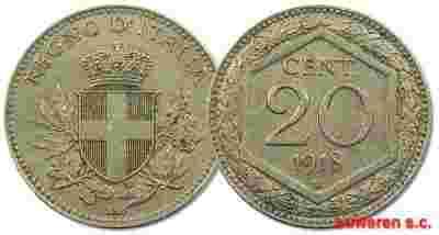 28.WŁOCHY, VITT.EM.II, 20 CENTESIMI 1918 przebitka