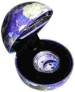 Każda moneta umieszczona w specjalnym etui w kształcie kuli Ziemskiej.