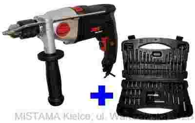 wiertarkę udarową, komplet 40 różnych akcesoriów w walizce z tworzywa sztucznego (opis powyżej), walizkę z tworzywa sztucznego, rękojeść dodatkową ze zderzakiem głębokości wiercenia, uchwyt wiertarski z kluczykiem, instrukcję w języku polskim, kartę gwarancyjną oraz dokument zakupu (FAKTURA VAT), bez którego gwarancja jest nieważna !!!