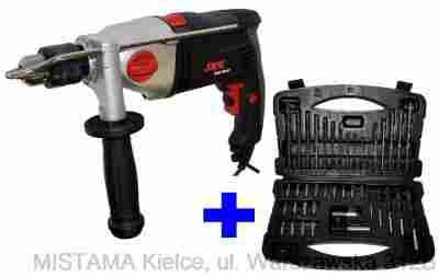 wiertarkę udarową, komplet 40 różnych akcesoriów w walizce z tworzywa sztucznego (opis powyżej), walizkę z tworzywa sztucznego, rękojeść dodatkową ze zderzakiem głębokości wiercenia, uchwyt wiertarski z kluczykiem, instrukcję w języku polskim, kartę gwarancyjną oraz dokument zakupu (FAKTURA VAT), bez którego gwarancja jest nieważna !!!